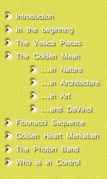 Introducton In the beginning The Vesica Pisces The Golden Mean The Golden Mean in Nature The Golden Mean in Architecture The Golden Mean in Art The Golden Mean and DaVinci Fibonacci Sequence The Golden Heart Merkabah of Creation The Photon Band Who is in Control? Articles